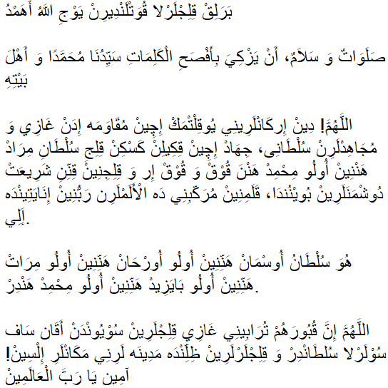 “Bismillahirrahmanirrahim. Hak dinin bağlarını parıltılı ve açık harfli ayetlerle ve keskin ve parlak kılıçlarla güçlendiren yüce Allah’a hamd olsun. Salat ve selam, en güzel fasih sözlerle vasfedilen Hazret-i Muhammed ve ehli beytine olsun. Allah’ım! Dinin erkânlarını yüceltmek için mücadele eden gazi ve mücahitlerin sultanı, cihat için çekilen keskin kılıç olan Sultan Murad Han’ın oğlu Mehmed Han’a güç kuvvet ver ve kılıcının kınını şeriat düşmanlarının boynunda, kaleminin mürekkebini de alemlerin rabbinin inayetinde eyle. O, Sultan Osman Han’ın oğlu Orhan Han’ın oğlu Murat Han’ın oğlu Bayezid Han’ın oğlu Mehmed Han’dır. Allah onların mezarlarının toprağını, gazilerin kılıçlarından akan saf su ile sulasın ve kılıçların gölgesi altında olan cenneti de mekânları eylesin! Âmin Ya RabbülÂlemin.”